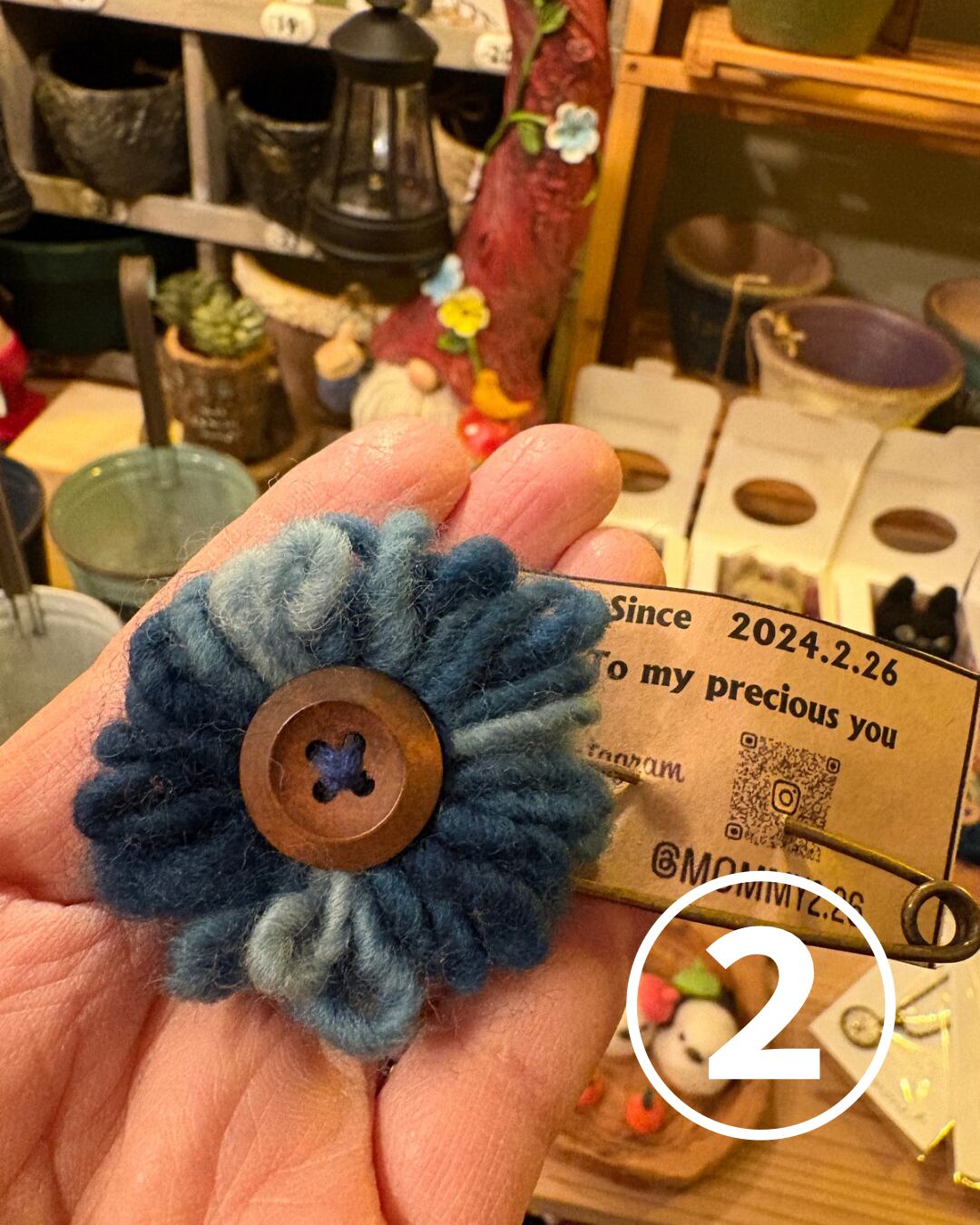 ほっこりとした毛糸を贅沢に使い、お花のように仕立てた温かみあふれるクリップです。中央にあしらった木のボタンが、ナチュラルなアクセントになっています。