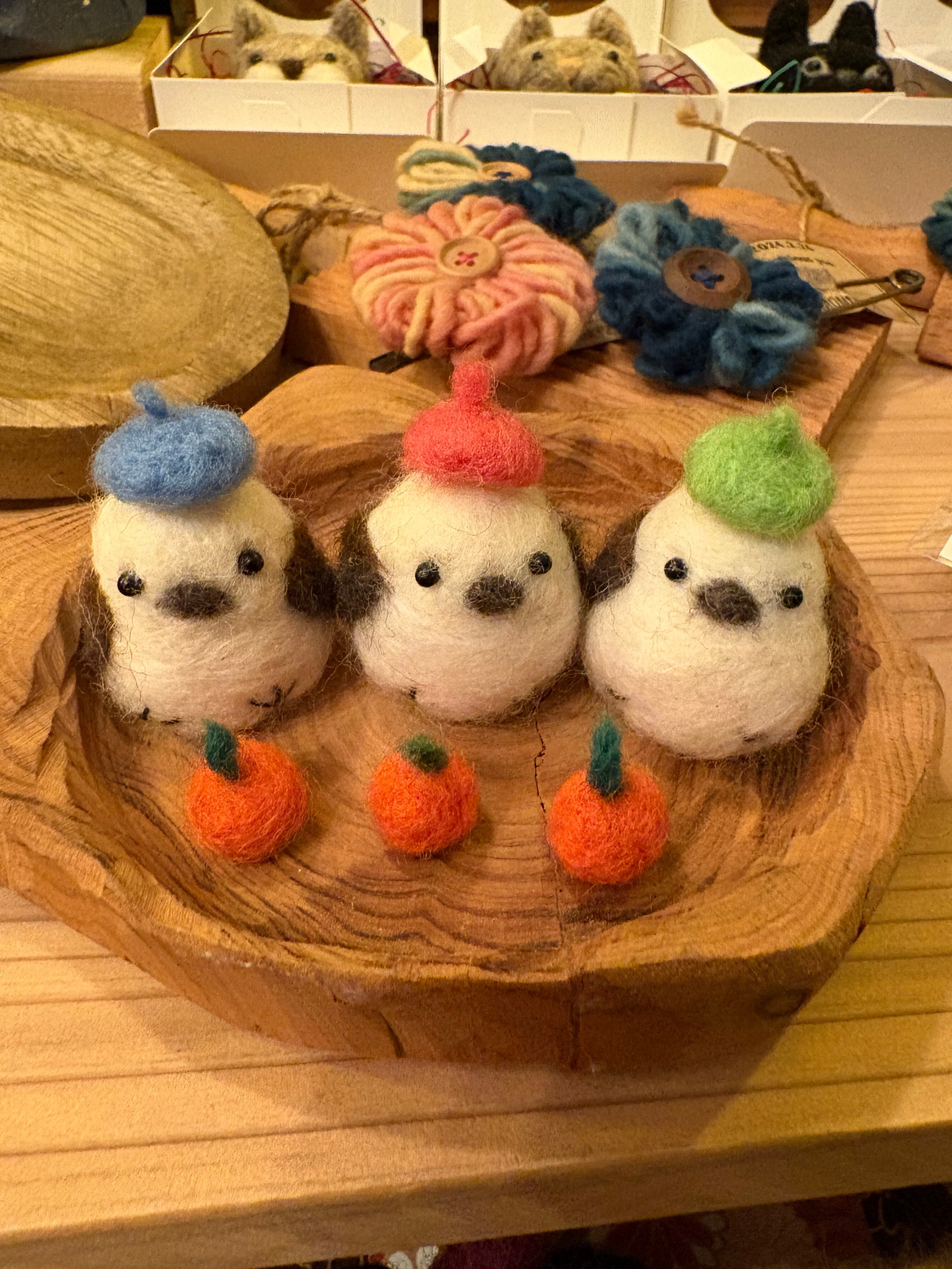 羊毛フェルトならではの温かみのある質感で、手のひらに乗せるとほっこりとした癒やしを届けてくれます。玄関やデスク、棚のちょっとしたスペースに並べて飾るだけで、お部屋の雰囲気がパッと明るくなります。