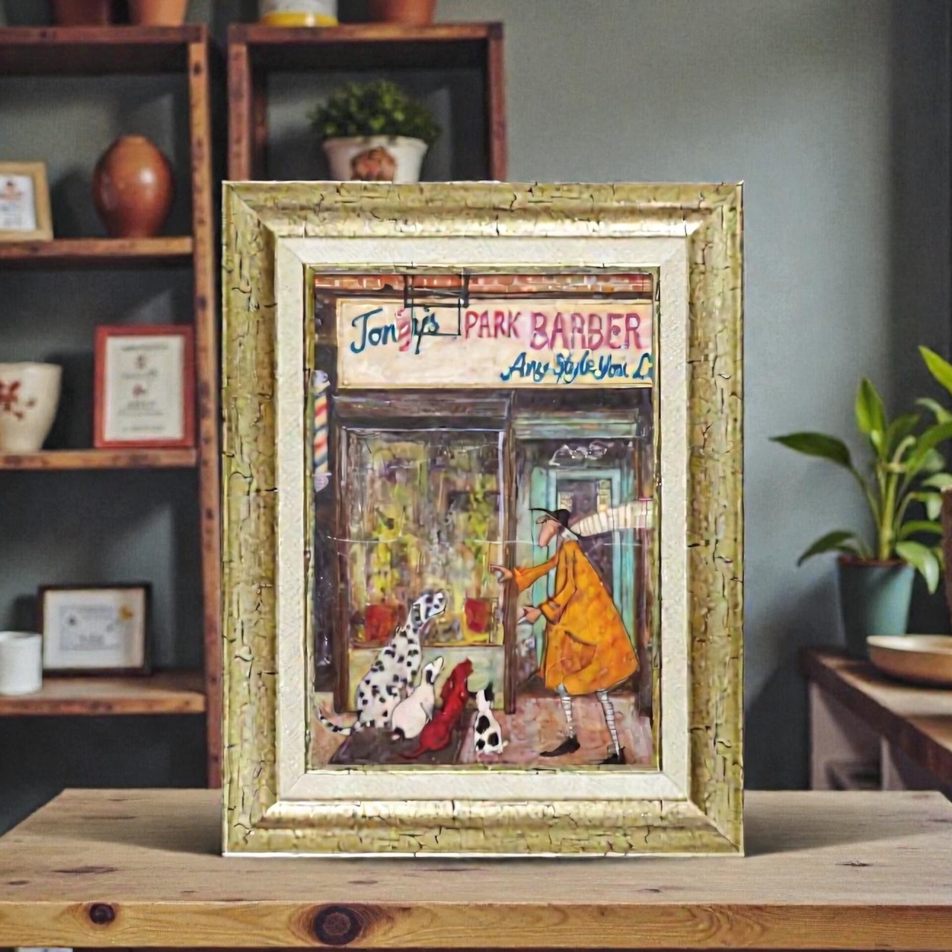 「今日はどんな髪型にしてもらおうかな?」なんてお喋りが聞こえてきそうな、ユーモアたっぷりのワンシーンが描かれています。