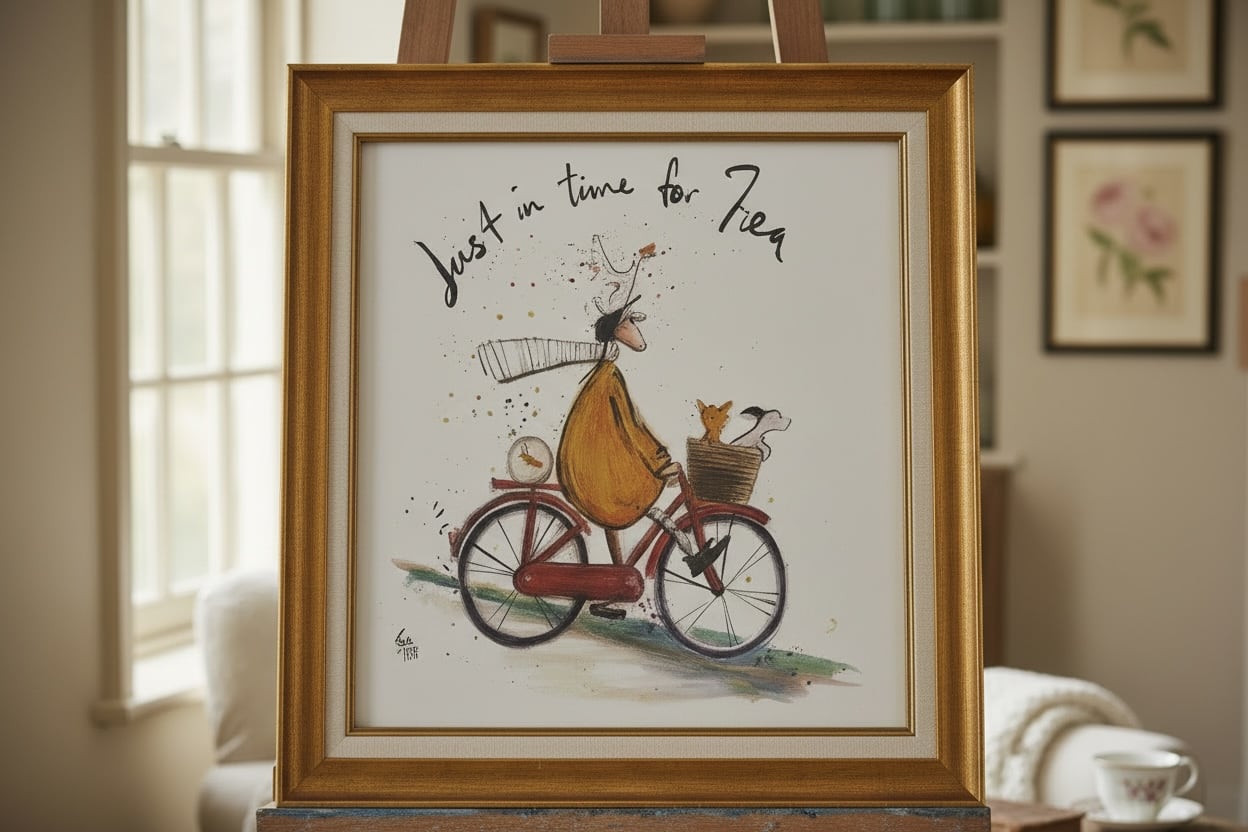 自転車を走らせ、ティータイムに間に合うように急ぐアーネスト(ミスター・マスタード)の姿がユーモラスかつ温かく描かれた、大人気の作品です。