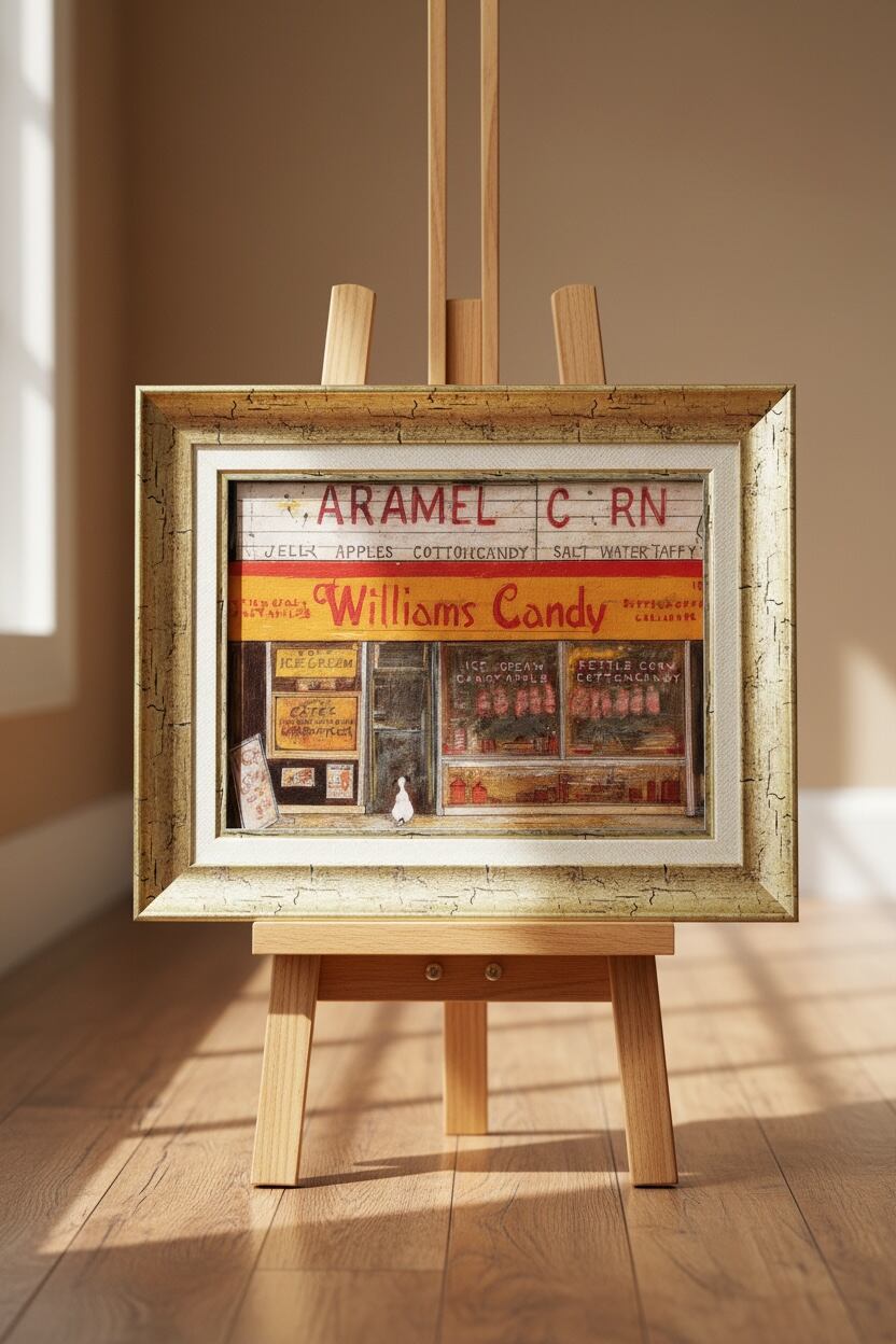 この作品の主役は、キャンディショップ「Williams Candy」の前にちょこんと座る愛犬ドリスです。